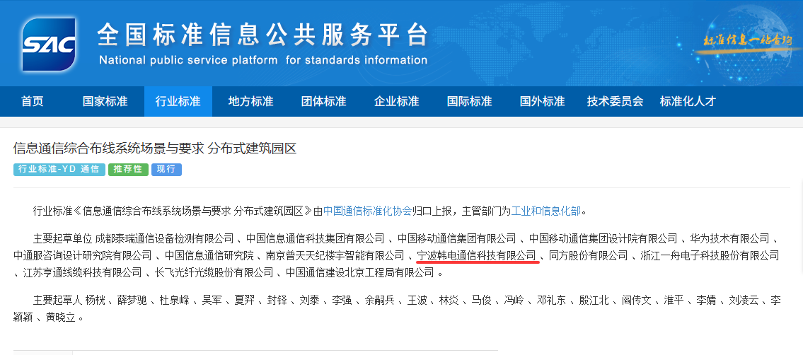 韩电通信参与制定分布式园区布线标准,引领智慧园区新基建!![]() 韩电通信参与制定分布式园区布线标准,引领智慧园区新基建! 近日,工业和信息化部发布公告,通信行业标准YD/T 6447-2025《信息通信综合布线系统场景与要求 分布式建筑园区》 正式发布,于2025年11月1日起实施。韩电通信科技有限公司作为主要起草单位之一,深度参与了该标准的制定工作。这一重要文件的发布,标志着我国分布式建筑园区综合布线系统正式进入标准化、规范化发展新阶段。 ![]() 一、标准体系完善,韩电引领创新 ![]() 信息通信综合布线系统标准体系包含三大核心板块:通用规范、测试标准和场景与要求。其中场景与要求根据应用特点,细分为商务楼宇、工业互联网、住宅、数据中心及分布式建筑园区五大领域。 本次发布的标准专注于分布式建筑园区这一复杂应用场景,明确了园区综合布线系统的结构原理、性能指标及测试要求,为智慧园区建设提供了权威技术依据。 二、赋能智慧园区,打造互联标杆 ![]() (韩电通信案例:宁波方太集团高端创新园区一期) 凭借在信息通信领域深厚的技术积淀,韩电通信为分布式园区布线标准的制定贡献了重要支持与实践经验: -全域架构设计:构建覆盖多栋建筑、跨区域的统一布线架构 -高性能传输保障:确保远距离、复杂环境下的稳定传输性能 -标准化管理规范:建立统一的安装、测试与运维标准 该标准与YD/T 926系列标准协同配套使用,形成了适用于分布式园区的完整技术规范体系。 三、共创产业未来,筑基数字中国 韩电通信的深度参与,不仅是技术实力的体现,更是企业对行业责任的担当。未来,韩电通信将继续携手产业伙伴,积极参与更多细分领域的标准制定工作,以创新技术赋能行业数字化转型,为数字中国建设贡献智慧与力量。 ![]() ![]() 关于我们 宁波韩电通信科技有限公司,自2002年成立以来深耕综合布线领域二十余载,现已成为集研发、生产、销售及系统解决方案服务于一体的全球化通信科技企业。 【核心优势】 ✅全场景布线方案专家 专注数据通信电缆、安防弱电线缆、光纤光缆及智能布线系统研发,提供从硬件到系统的全链路智慧连接方案。 ✅全球品质认证矩阵 • IS09001质量管理体系、IS014001环境管理体系及IS045001职业健康安全管理体系认证; • IQNet质量管理体系、IQNet环境管理体系及IQNet职业健康安全管理体系认证; • 权威产品认证:工信部TLC泰尔、TSK、ETL、CE、RoHS、Delta、GHMT、3C、欧盟CPR等多项产品认证; • 连续多年蝉联行业双十大殊荣:中国工程勘察设计行业十大优秀品牌/中国智能建筑行业十大匠心品牌等。 ✅国际化的中国智造 产品辐射全球30+国家地区,在欧美及东南亚市场建立长效合作网络,布线技术获多国工程标准认证。 【标杆工程图谱】 • 智慧教育:东南大学、哈工程、中科大等顶尖学府数字校园神经系统 • 智慧医疗:上海同济医院、成都温江人民医院等三甲医院智能诊疗体系 • 智慧交通:福厦高铁、珠海横琴口岸、南京/重庆/成都地铁数字动脉 • 智慧云脑:阿里成都数据中心、电信内蒙古云基地、泰康大数据中心 • 智慧场馆:滁州奥体中心、郑州奥体中心等国家级赛事神经中枢 【品牌承诺】 始终秉持“成为国内品牌领先的综合布线专家”的愿景,坚持“提供高品质的产品解决方案和服务”的使命,以“新思维、新智造、新发展”为价值观,不断推动技术创新和产业升级。 ![]() THE END |